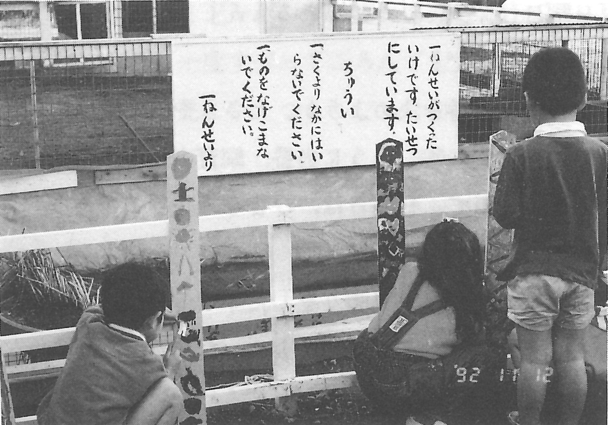 私は、子どもたちが魚の世話をしなくなったら、この池を埋めもどそうと考えています。つぎの1年生が池を必要とするなら、そのときは、また彼らが掘ればいいと思うのです。